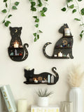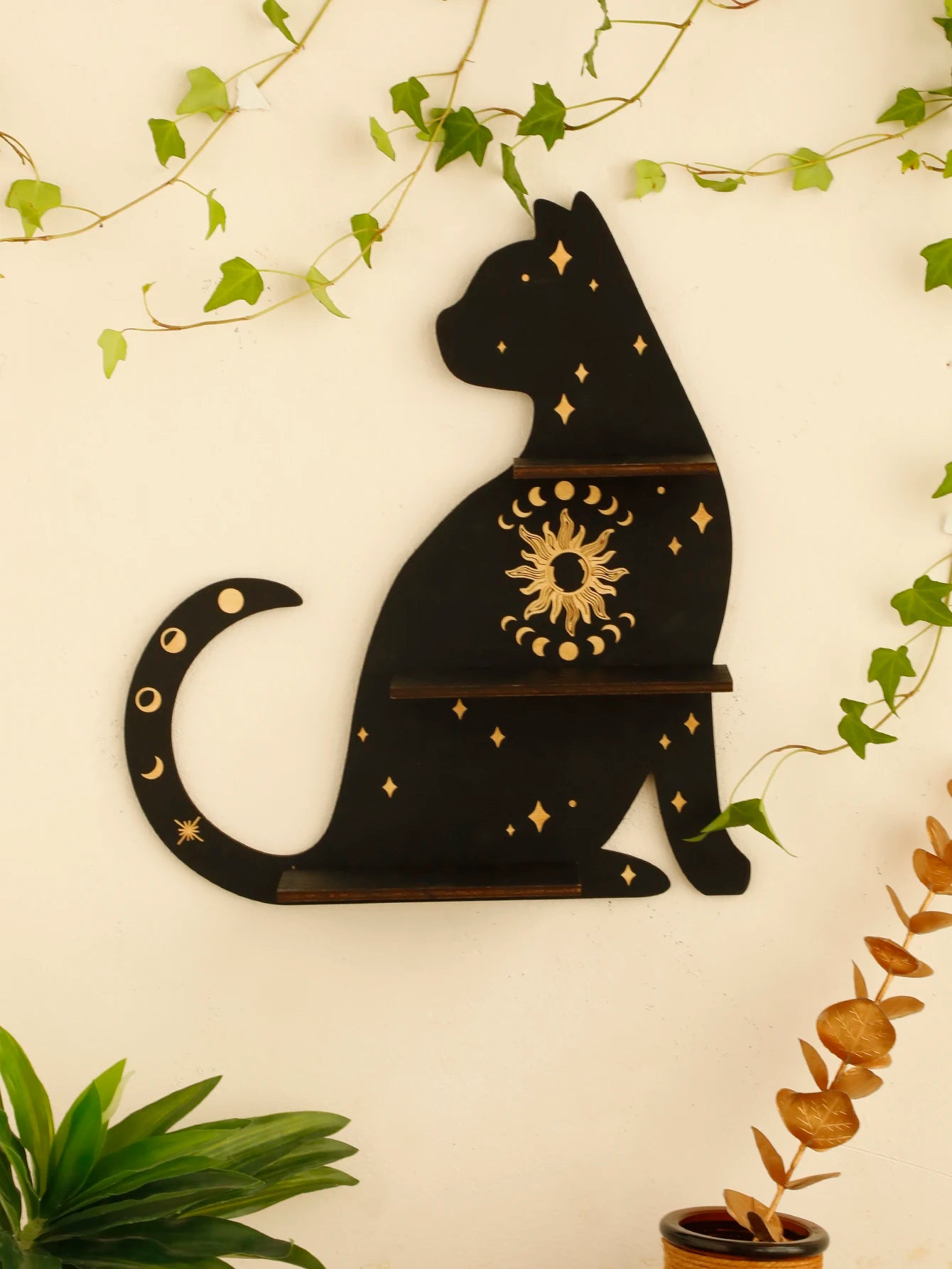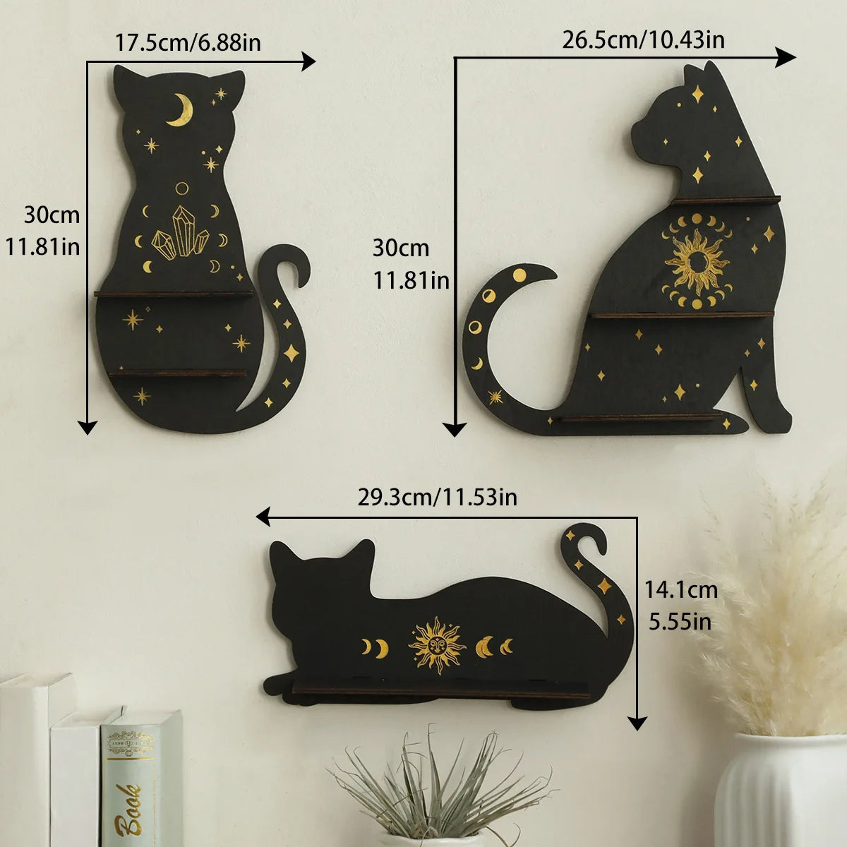 Wooden Shelf 1/2-Tier Moon Phase Black Cat Wall Shelves Crystal Display Stand Essential Oil Rack Ledge Gothic Home Decor Gifts