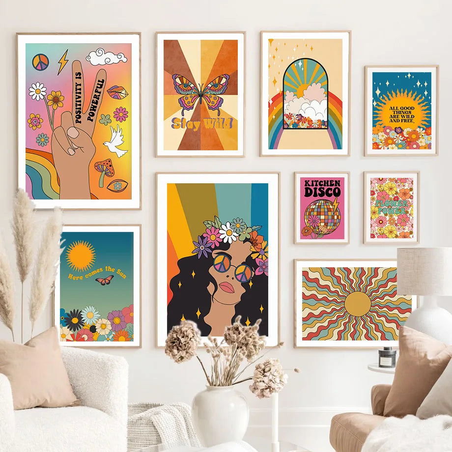 70s Hippie Disco Sun Butterfly Wall Art Canvas Painting Nordic Posters Aesthetic And Prints Wall Pictures For Living Room Decor